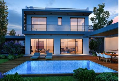 Each contemporary designed villa is generously proportioned and has a double garage with electric shutters and utility area, garden with summer kitchen, changing and W.C. facilities, swimming pool (10x5m.) on large plot. The living areas extended over three floors, including a spectacular roof terrace and benefit from open plan design, spacious and functional living areas, 3 spacious bedroom with en-suit bathroom and large windows witch bring natural daylight and views inside.