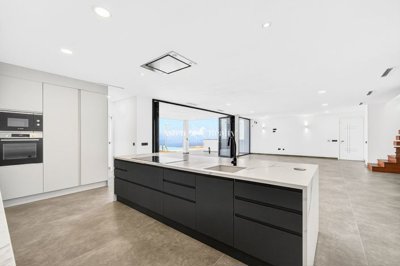 The new designer kitchen was recently installed, offering sea views, upper and lower cabinets, and an island with an additional sink. Fully equipped with high-end appliances.