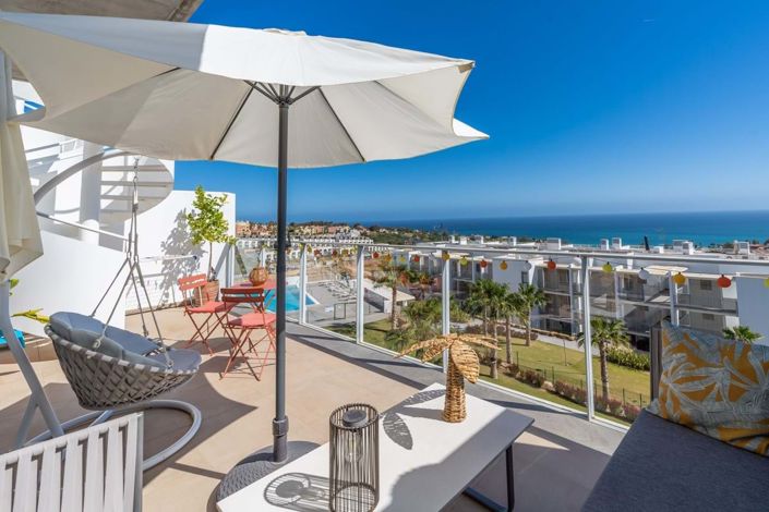 This stunning 2-bedroom penthouse in Manilva offers stunning panoramic views of the Mediterranean Sea from the rooftop terrace.