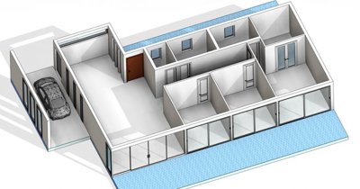 Inside the bungalow, there is a large living room, dedicated space for the dining area and kitchen. Further along the corridor are a utility room, two large family and guest bedrooms, a bathroom and a master suite with a dressing room.