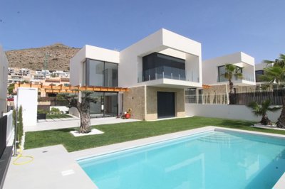 Embracing an exceptional setting, the villas for sale in Alicante are ensconced in an exclusive, peaceful, and secure enclave. Positioned upon an elevated terrain, each villa enjoys captivating vistas of the azure sea and optimal orientation that maximizes sunlight exposure. A mere 5-minute journey from the available villas unveils a sprawling shopping center, catering to every retail desire with an array of shops and supermarkets. Similarly convenient is the proximity to a well-connected bus station, while a short additional drive leads to the city of skyscrapers, none other than Benidorm. Here, a dazzling cityscape awaits, complemented by year-round events, an assortment of theme parks such as Terra Mitica, and a comprehensive suite of essential amenities including schools and medical centers.