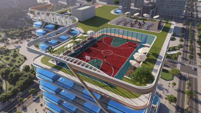 Rooftop amenities including a basketball court and outdoor cinema