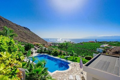 We are pleased to present this jewel of a property located on the southwest coast of Tenerife, only 2 km (4 minutes) from the ocean and the Los Gigantes Cliffs, where the sun shines 300 days a year; without a doubt the best climate on the island, statistically.The villa has a plot of almost 11.000 m2 where there is a main house with 3 bedrooms each with its own bathroom. A glazed living room with the best views of the area, where you can appreciate the valley, the banana trees, the neighbouring islands and the ocean, all this framed with the sunsets directly in front of the property. The open plan kitchen is generously sized and connected to the living room and leads out onto the terrace/solarium which surrounds the entire property creating different spaces to enjoy. There is also a laundry area, a street inside the property that gives access to the exclusive parking area for the main house.In addition, there are two one-bedroom apartments, each with its own bathroom, living room, kitchen, air conditioning and licensed for holiday rentals. They have their own private parking space.The whole property has been completely renovated 1 year ago, including the change of electrical installation, water pipes, equipment and furniture, automatic irrigation for all plants, trees and fruit trees. It has been characterized with a fresh New Age style, a natural environment surrounded by palm trees and all kind of plants, creating a unique and really private space for the views outside the property.The large swimming pool has its own chill out area with lounge chairs and sun loungers, a bar and storage area, bathroom with shower and a laundry area for the rental apartments. Year of construction: 2005. Refurbished in 2023.IBI: €980/year.No community fees.Asten Realty reference: 9138.