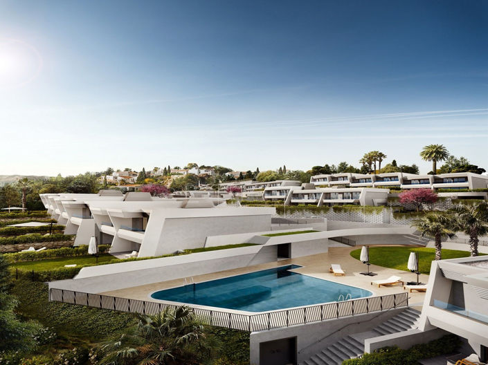 This exclusive collection of three-bedroom townhomes showcases breathtaking sea views, a sleek architectural design, and cutting-edge home technology. These luxury residences are thoughtfully designed with spacious interiors where the living area, dining space, and fully equipped kitchen with a breakfast bar blend harmoniously into an open-concept layout, maximizing natural light through expansive triple-aspect windows and doors. The transition from indoor to outdoor space is effortless, with generous covered and open terraces that offer a relaxing retreat with stunning views of the golf course and the southwest coastline stretching out to the Mediterranean Sea.