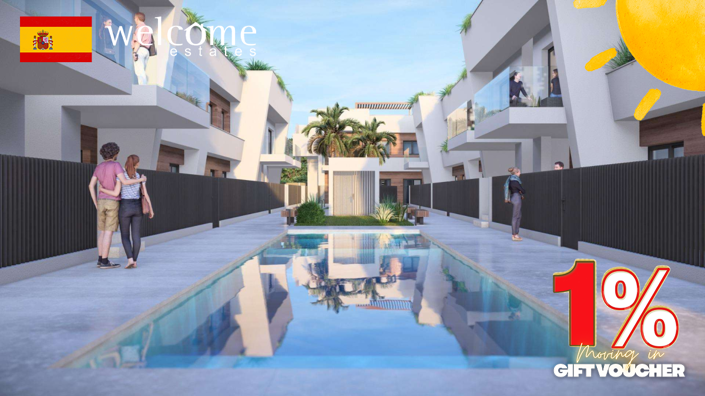 THIS PROPERTY INCLUDES A 1% WELCOME ESTATES GIFT! Which can be redeemed for white goods, furniture lighting and much more. New Construction Homes in Torre-Pacheco, Costa CálidaModern Bungalows with Exceptional FeaturesDiscover a new residential complex in Torre-Pacheco, offering 24 stylish bungalows with two or three bedrooms. Choose between ground-floor homes with spacious terraces or first-floor units boasting private terraces and solariums. Each solarium includes a pergola, a barbecue area, and reinforced roofing, perfect for installing a jacuzzi. All homes come with a designated parking space and fully installed air-conditioning, ensuring comfort year-round.Prime Location in Torre-PachecoNestled in the heart of Torre-Pacheco, this development enjoys proximity to essential amenities, including supermarkets, shops, bars, and restaurants. The vibrant town center, with its charming Spanish ambiance, is within walking distance. For beach lovers, the amazing Mar Menor is just a 10-minute drive away, offering golden sands and crystal-clear waters.Enjoy Outstanding Community AmenitiesThe complex features a beautifully landscaped community area with lush gardens and a sparkling pool, providing a serene retreat to relax and unwind. The area’s sunny climate, averaging 320 days of sunshine annually, complements these outdoor spaces perfectly.Surrounded by Award-Winning Golf CoursesTorre-Pacheco is a golfer’s paradise, surrounded by some of the most renowned golf courses in Spain. These courses are just a quick trip in the car, making it a perfect location for golf enthusiasts.Strategic Connections to Key DestinationsMurcia International Airport: twenty kilometres (approximately twenty minutes by car).Train Station: Only 700 meters away, offering convenient travel options.Shopping Centers: Several large shopping complexes within a fifteen kilometres radius.Beaches: The beautiful Costa Cálida beaches are a mere ten kilometres away.Ports and Marinas: The closest marina is around 12 km away, perfect for boating and water sports.A Healthier Lifestyle AwaitsThe Costa Cálida region is renowned for its exceptional quality of life. With low humidity, clean air, and a subtropical climate, this area is one of the healthiest in Spain. The perfect combination of natural beauty, sea breezes, and abundant sunlight makes Torre-Pacheco a highly sought-after destination.Act Now to Secure Your Dream HomeDon’t miss this opportunity to own a modern home in a prime location. Contact us today to learn more about this incredible development or to schedule a viewing!