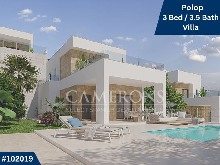 Brand new development of 36 villas, 3 bed and 3 or 3.5 bath, and you can choose from one or two levels.All villas come with their own private pool, and the one level villas include a solarium.The development is located in Polop, and close to sports areas, supermarkets, bars and the beach. Surrounded by nature, all services, and several Golf Courses.With plot sizes from 350m2 up to over 600m2, there are several options to suit your needs.The property will meet the highest standards and will be equipped with a special launch offer of :LIGHTING + SHOWER SCREENS + WHITE GOODS PACK INCLUDED FOR FREE!Click here to view 1 level Villa