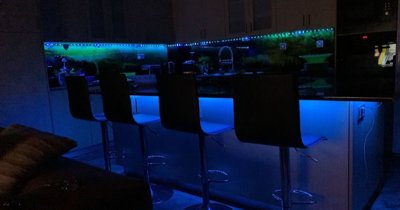 The warm wooden tones of the kitchen cabinets are both stunning and practical, while the 'graphic pattern' backsplash adds a delightful contrast to the overall aesthetic. Additionally, the kitchen island is equipped with advanced lighting systems, including color-changing LED strips that create a romantic evening ambiance. Spacious and functional, this kitchen is truly the heart of the home - perfect for family gatherings or preparing something special.