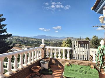 A good concrete road to arrive at the property with a large 2 car garage with storage space. Via a few steps you go up to the main entrance of the house where you will find a lovely sunny terrace with awnings that cover the whole area with pretty views to the town of Alhaurin el Grande, mountains and surrounds. Going into the property, you have to your left a downstairs toilet and under the stairs storage, and the open large living / dining room is to your right with a semi open fully fitted kitchen. The property has several nice features like a large wood burning fireplace, spanish style and air conditioning hot and cold. From here you can access by patio doors the back of the property. Also on the first floor is a large bedroom with ensuite bathroom with shower.