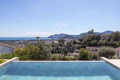 Close to the shopping facilities, on the hillside of Les Termes, this superb villa was completely renovated in 2025 in a contemporary style. South-Facing, the property boasts panoramic sea views and is split over two levels to provide the main level with a living/dining room with large bay windows, an open-plan kitchen, a master bedroom with bathroom, a dressing room that could be converted into another bedroom and an independent toilet. The pool level has two bedrooms, each with its own bathroom, and a laundry room.