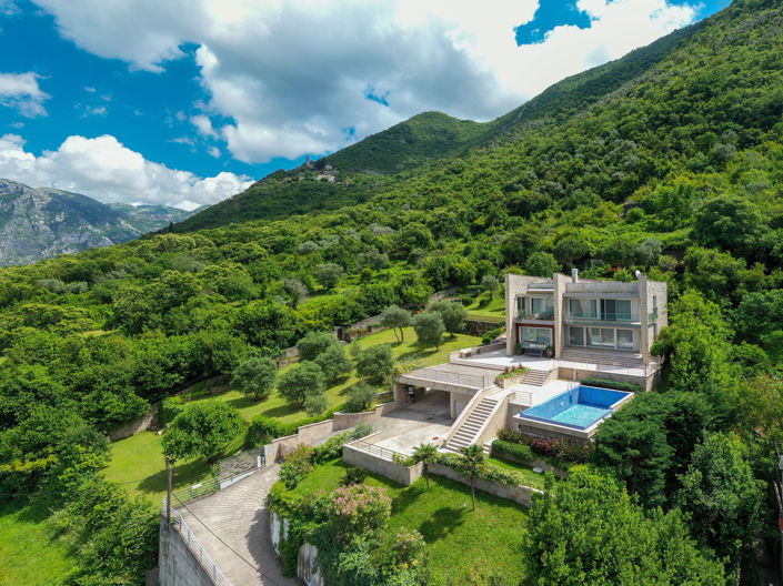 Four-bedroom villa with a swimming pool and panoramic bay view in Stoliv, Kotor. In 2012 at a world competition in Mexico, the villa was awarded with a III place prize.