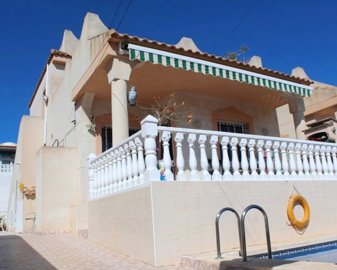 "READY TO MOVE IN" This wonderful 103m2 detached VILLA with 3 bedrooms, 2 bathrooms is located in BLUE LAGOON, SAN MIGUEL DE SALINAS on a plot of 200m2 with a private12m2 pool and various sunny terraces. On the ground floor there are 2 double-sized bedrooms, 1 renovated bathroom, an open plan fully equipped kitchen, a large living/dining room and a storage room. Entering through a staircase from the outside you will find on the 1st floor a separate spacious studio flat with a bedroom, separate shower room, kitchenette and a living room which leads out to a large terrace area with a BBQ and beautiful views! On the 2nd floor is another large roof terrace with a solar panel for hot water and an amazing view of the sea and salt lakes! The property is situated in a very quiet area with sun all around the house and is in walking distance to all amenities, supermarkets (Mercadona and Aldi), restaurants and bars, new public pool, “Green Lands ”, Minigolf, El Limonar - International School and the popular Villamartin PLAZA and La Fuente commercial centre is very near. The beautiful beaches of Orihuela Costa only 4km away and the famous shopping centre Zenia Boulevard with over 150 shops, bars and restaurants is only a few minutes’ drive by car.Many extras include; electric entrance gate, laundry room, fly screen blinds on ALL windows upstairs and downstairs, 4 air conditioning units hot & cold gas central heating and it is sold fully furnished. Blue Lagoon is surrounded of the most beautiful golf courses in the area Real Club de Campoamor, Las Ramblas, Villamartin, Las Colinas etc... This is a home to live in all year around and has a very good RENTAL POTENTIAL. Corvera Airport in Murcia and El Altet Airport in Alicante are both 45 minutes’ drive by car.