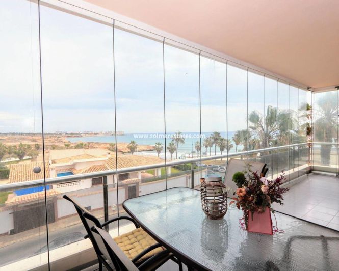 Stunning sea views from a large terrace. 2nd-floor apartment for €349,900. Discover this spectacular seafront apartment, a unique opportunity for those who value a privileged location and unparalleled views. Located on the second floor, the home offers stunning sea views from both the interior and the large terrace, making it the perfect place to relax, have breakfast, or watch the sunrise over the Mediterranean. 120 meters from the beach. The property has approximately 135 m² distributed across 3 spacious bedrooms, 2 full bathrooms, a bright living-dining room, and a fully equipped separate kitchen. The east-facing orientation ensures excellent light throughout the morning, bringing warmth and well-being to the spaces. The apartment is located in a recently renovated residential complex that includes a communal pool, green areas, new elevators, and access points adapted to current regulations. It is also equipped with air conditioning to ensure maximum comfort throughout the year. Its location in Playa Flamenca is another of its great attractions. It is just a short walk from supermarkets, restaurants, cafes, and all kinds of services, and very close to the Zenia Boulevard shopping center, one of the largest in the province with a wide range of shopping, leisure, and gastronomic offerings. The area also offers numerous leisure and tourism activities, Blue Flag beaches, internationally renowned golf courses such as Villamartín, Las Ramblas, and Campoamor, water sports, hiking trails, natural parks, and local markets, such as the Saturday market. Playa Flamenca is one of the most sought-after areas of Orihuela Costa, perfect for permanent residence or investment. Don't miss the opportunity to live with exceptional sea views and all the amenities that this magnificent home offers. Property tax €340, Price €349,900.