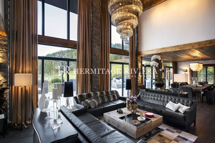 The chalet of 1080 sqm living space located directly by the slopes and near the downtown. Living room with a stone fireplace, dining room with large windows offering panoramic views. There are 8 spacious bedrooms for more than 20 people. The cottage has a jacuzzi, steam room, gym, game room, cellar and escalator for suitcases. The cottage has two extra rooms for staff. Floor heating. Covered parking for 4 cars and parking for 10 other vehicles.