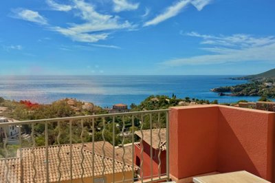 Spread over two living levels, it includes a living room and a sheltered terrace with a stunning panoramic view of the sea and Estérel, a fitted kitchen, and a toilet. The upper floor has a shower room with Wc and two bedrooms, one of which features a beautiful south-facing balcony, still offering that magnificent sea view.