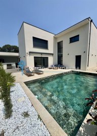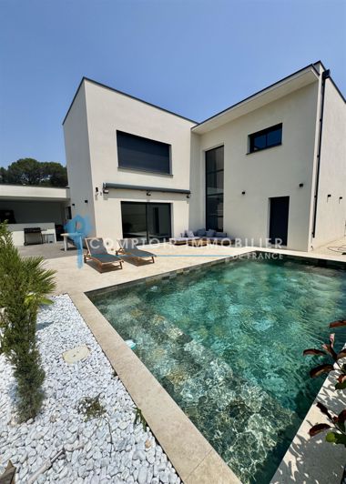 For sale? Vergèze, a 2023 contemporary villa with high-end features of approximately 194 m2 on 455 m2 of land A 10-minute walk from the train station, a 1-minute walk from the college, and less than 10 minutes from the village. Located in one of the most sought-after areas of this village, this contemporary villa built in 2023 still benefits from the ten-year guarantee. Not overlooked, on a landscaped plot of 455 m2, it offers a living area of 194 m2, designed for comfort and modernity. Upon entering, you'll be captivated by a vast, 100 m2 cathedral-style living room with a 7-meter ceiling height, bathed in light thanks to large aluminum bay windows. The fully equipped open-plan kitchen connects to a large adjoining laundry room. On the ground floor, a luxury master suite with a bathroom (walk-in shower, bathtub) and separate toilet completes this level. The spacious living room allows for the creation of an office or an additional bedroom depending on your needs. Upstairs, a beautiful 14 m2 mezzanine overlooking the living room can be used as a library, games room, or office. Three bedrooms of approximately 12 m2, all with built-in wardrobes, share a bathroom and a separate toilet. The exterior is a real living space: swimming pool with Balinese-style tiling, maintenance-free landscaped garden, equipped summer kitchen and a shower room and Wc. Among the services: ducted air conditioning, centrally locked roller shutters, light regulators in each room, aluminum joinery, water softener. A rare and unusual property in the area, to be discovered without delay.