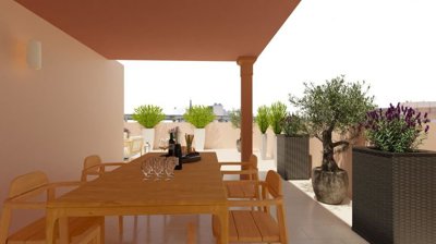 Experience panoramic 360º views of the sea, mountains, and city from this fully renovated penthouse in Forners, Palma. Just minutes from the beach, shopping, and the airport, this exceptional property features an expansive 200 m² terrace and stylish interiors designed for luxurious Mediterranean living.. . Key Features. - 200 m² private rooftop terrace. - 4 bedrooms, 2 bathrooms. - Large living room with fireplace and terrace access. - High-quality renovated kitchen with breakfast bar and American-style fridge. - Master suite with walk-in closet and modern en-suite bathroom. - Additional sleeping area with 3 bedrooms and scenic bathroom. - Sauna setup in covered veranda. - Motorized shutters and mosquito screens throughout. - Central air conditioning and heating. - Direct access to private parking space. - Quiet building with elevator. - Recently updated plumbing and electrical systems