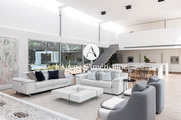 The main floor features a luminous double-height living space seamlessly integrating lounge, dining area, custom kitchen, and a mezzanine office. South-Facing terraces lead to a heated infinity pool, a pool house, and a lush private garden.