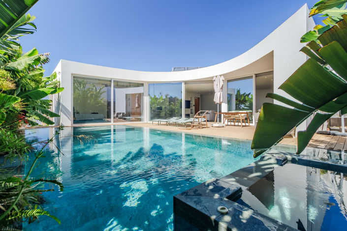 Ascending to the first floor, the villa's main living space unfolds, showcasing an open-plan, fully equipped kitchen, dining area, and living room that seamlessly transitions to a tropical-inspired outdoor space. This area epitomizes the essence of indoor-outdoor living. The first floor also houses the luxurious master suite, complete with a large bathroom featuring a walk-in shower. Additionally, there are two generous bedrooms that share a spacious family bathroom, also equipped with a walk-in shower.
