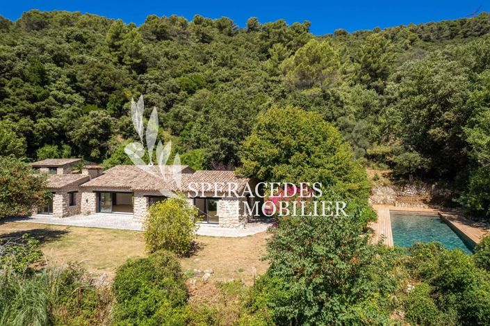 With a surface area of approximately 300 sq.m, entirely on one level, it comprises a bright double living room with high ceilings, a stone fireplace, a large kitchen with dining area, 4 bedrooms and 3 shower rooms.