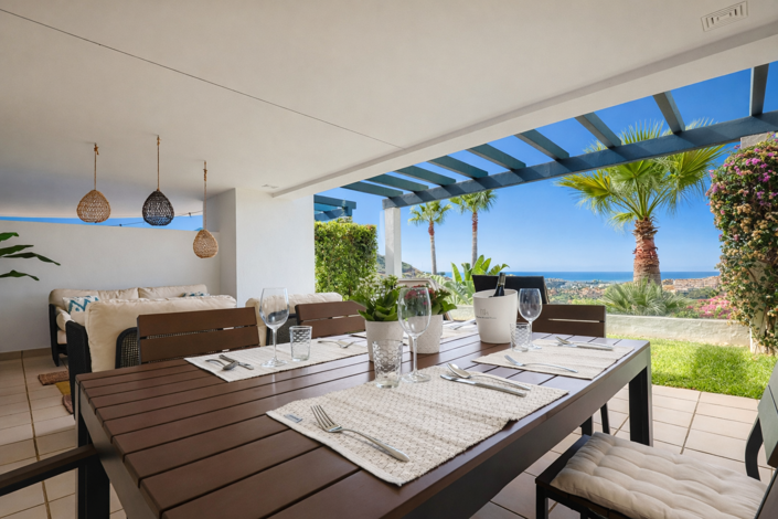 The living area flows seamlessly onto the apartment’s standout feature: a stunning terrace and garden. Partly covered, this outdoor space is perfect for al fresco dining, relaxing in the Spanish sun, or simply enjoying the serene surroundings.