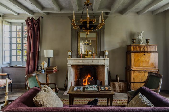 The living room has a painted ceiling leaving the beams exposed, an eighteenth-century neoclassical fireplace, and oak parquet flooring. A side gallery develops a set of friezes painted in grisaille imitating bas-reliefs.