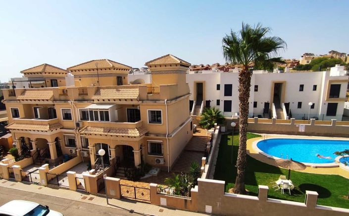 Casas Lilley are pleased to present to you this 3 bedroom 2 bathroom Townhouse in Los Altos. A couple minutes drive to the local supermarket Aldi and other convenient shops and bars. Upon arrival of this property you are greeted with a large front terrace which wraps around the house creating a spacious back garden area which overlooks the stunning communual pool area. Inside is just as spacious with a large living area, fully equipped kitchen which leads on to a washroom which currently is also used as a spare room, handy for guests. There is a downstairs shower room as well as an upstairs bathroom and 3 double bedrooms all complete with fitted wardrobes. This impressive property also has new air conditioning systems fitted throughout the house. Take a look at the photos and video!