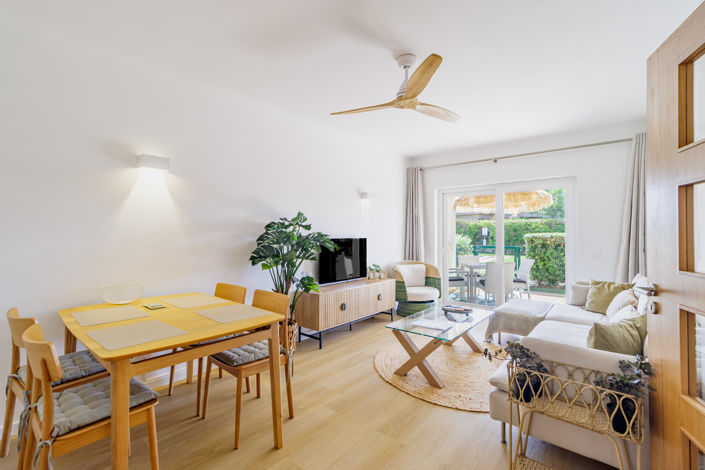 A welcoming hallway leads into a bright open-plan living and dining area, which seamlessly connects to a spacious private terrace overlooking the pool - perfect for alfresco dining or simply relaxing in the sun. The kitchen has been cleverly designed to maximize space while offering a sleek and functional layout.