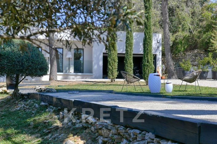 Contemporary villa of 191m² entirely on one level on a plot of 2,200m² in a quiet area and not overlooked, less than 5 minutes from the historic center. This very beautiful achievement executed with high quality materials and finishes combines a resolutely contemporary style with a warm and comfortable atmosphere. The 72m² living room opens wide via sliding windows onto the terrace with swimming pool and onto the patio, top-of-the-range fitted kitchen. The sleeping area includes a 32m² master suite opening onto its private terrace, 2 bedrooms, a bathroom, a laundry room and an office (or additional bedroom). 30M² gym. Sheathed reversible air conditioning, Focus fireplace, home automation, alarm, water softener. The landscaped Mediterranean garden, perfectly maintained and offering an unobstructed view, houses various spaces including a brazier, a bar, a large jacuzzi and a pétanque court. Garage. Possibility to build an additional 30m². The villa can be sold with all of its designer furniture, decoration and equipment. 12 minutes from the Tgv station, 25 minutes from Nîmes airport and 55 minutes from Montpellier airport.