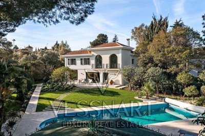 Benefiting from a beautiful location in the heart of Cap D'Antibes and a magnificent flat garden, this spacious family villa of approximately 300 m² has been completely renovated with quality materials. The villa includes 5 beautiful bedrooms including a magnificent master bedroom, a beautiful living room opening onto terraces and the flat garden with its new 15 m long swimming pool. A full double garage is very rare.