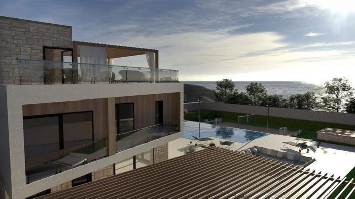 Lower floor will offer entrance hall, toilet, storage and a large open space of 73.20 m2 in which will be located a modern large kitchen with island, dining room and living room with fireplace. There will also be an Istrian-style tavern on the ground floor with a large fireplace and a wooden table with benches. The tavern will have its own separate storage room with aguest wc. Access to the tavern will be both from the inside of the house and from the outside of the house. On the ground floor there will be 3 large glass walls overlooking the swimming pool and an outdoor covered terrace with a large table.