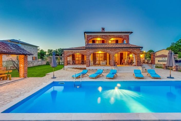 Located in the peaceful countryside near Višnjan, this traditional Istrian stone villa perfectly blends authentic regional charm with modern comfort and upscale amenities. With a net living area of 204.93 m² and set on a spacious and beautifully landscaped plot of 2,066 m², the property offers complete privacy and tranquility, ideal for a serene lifestyle or luxurious holiday retreat.The villa is spread over two floors and features four bedrooms, generous living areas, and a variety of refined details that enhance the overall sense of warmth, elegance, and quality.On the ground floor, the entrance hallway leads to a guest toilet and an open-plan living space centered around an authentic Istrian fireplace. The living room connects seamlessly with the modern kitchen and dining area, and large glass doors open onto the covered terraces and the lush garden. This level also includes two comfortable bedrooms, both with direct access to the outdoor area, allowing for plenty of natural light and a strong connection with the surrounding nature.An interior staircase leads to the upper floor, where two additional spacious bedrooms are located, each with a private en-suite bathroom and access to terraces that offer scenic views of the surrounding greenery and countryside.The outdoor space is thoughtfully designed to create a private oasis for relaxation and entertaining. The large garden features a private swimming pool and jacuzzi, a covered outdoor kitchen with barbecue, and a safe, well-maintained children’s playground. Mediterranean plants, lavender, rosemary, and paved garden paths create a visually pleasing and aromatic atmosphere, while the fully enclosed yard ensures both privacy and security.The property also includes two covered parking spaces, with the option to add more if needed. The home is sold fully furnished (excluding personal belongings), and includes high-end finishes such as underfloor heating throughout, air conditioning in all rooms, a wood-burning fireplace, first-class Italian ceramics, parquet in the bedrooms, and PVC windows with mosquito screens. Solar panel installations and pre-installation for central heating offer energy flexibility.Located just 20 kilometers from the Istrian coastline, the villa sits in a quiet area surrounded by nature and luxury homes. The area provides easy access to popular towns such as Porec, Novigrad, and Motovun, while Višnjan itself is known for its historic charm, observatory, and all necessary amenities including shops, restaurants, schools, and a pharmacy. The proximity to the highway ensures quick connections to the rest of Istria and the Pula airport.This property is ideally suited for families seeking a peaceful and high-end home in Istria, buyers looking for a stylish vacation residence, or investors interested in a profitable short-term rental opportunity with excellent return potential.A rare chance to own a timeless Istrian stone villa that brings together tradition, luxury, and lifestyle in one of the most charming regions of Croatia. Ref: RE-U-41536Overall additional expenses borne by the Buyer of real estate in Croatia are around 7% of property cost in total, which includes: property transfer tax (3% of property value), agency/brokerage commission (3%+VAT on commission), advocate fee (cca 1%), notary fee, court registration fee and official certified translation expenses. Agency/brokerage agreement is signed prior to visiting properties.