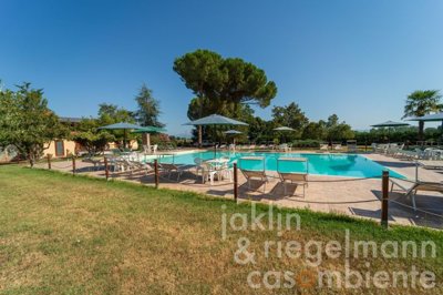 There is also an approx. 160 m² garage with approved project from the municipality of Castiglione del Lago for the construction of a further two apartments. A large space in front of the building is used as car park.
