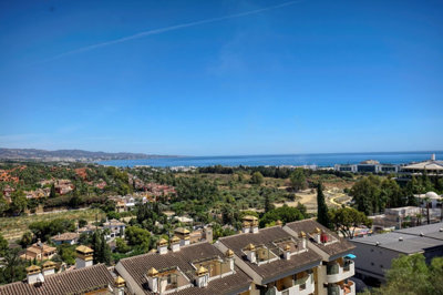 5 minutes walk to Centro Plaza in Nueva Andalucia and 20 minues to Puerto Banus this bright and spacious middle-floor apartment offers two bedrooms and two bathrooms, combining comfort with stunning surroundings. The open-plan living area leads onto a generous terrace, where panoramic views stretch from the iconic La Concha mountain all the way to the Mediterranean Sea. Large windows flood the interior with natural light, creating an inviting atmosphere throughout. The well-proportioned bedrooms include fitted wardrobes, while the master features an en-suite bathroom. Perfectly positioned within a gated community, the property enjoys beautifully maintained gardens and multiple swimming pools, all within walking distance to shops, restaurants, and the vibrant Puerto Banús