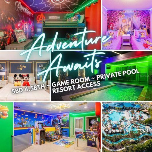 Fully furnished Themed short term rental. LED lighting inside and out. Game room in the house! Open layout with modern kitchen and private pool. Windsor Island Resort has amazing amenities: mini-golf, a resort style pool, waterslides, lazy river, and bar and restaurant. This home will impress any guests!