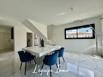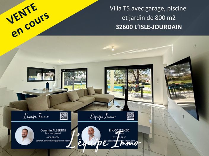 Only at L'equipe immo! L'isle-Jourdain: Close to the ring road and the town center, come discover this 2022 T5 villa with 143 m2 of living space, garage, and 8x3 swimming pool. On the ground floor, you have an entrance area leading to a 56 m2 living room with an open and equipped kitchen, a master suite, a toilet, a pantry, and a garage. The upper floor consists of a hallway leading to three bedrooms with storage closets, a bathroom, and a toilet. Reversible ducted air conditioning. All on a plot of over 800 m2. You're sure to fall in love.