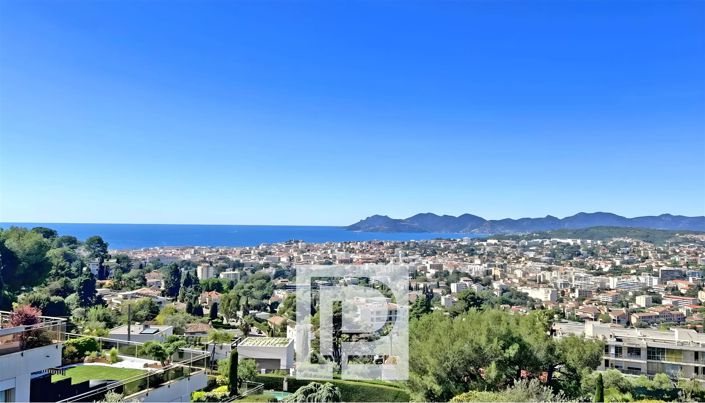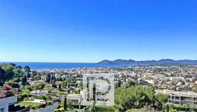 The spacious 60m² living room opens onto a terrace with unobstructed views of the sea, Cannes Bay, and the Estérel mountains. The apartment also features a separate kitchen with a laundry room, three bedrooms, a bathroom with a shower, and a separate shower room.