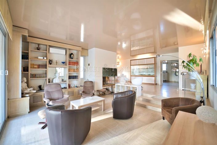 Set on a beautifully landscaped 1,900 m² plot, the villa offers over 230 m² of living space and includes a 190 m² full basement, providing numerous possibilities for conversion. It also features an independent artist’s studio, which can easily be transformed into a guest studio if desired.
