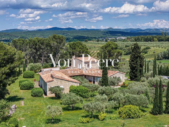 It is composed of an entrance hall, a large kitchen, a dining room bathed in natural light, a living room with a beautiful Louis XV fireplace, two suites with dressing room, an office, a laundry room, a wine cellar, a garage. The first floor leads to a large master bedroom with triple exposure and its large bathroom. The property also has a second independent guest house or large pool house to finish fitting, with a large semi underground basement space that can be converted into a cinema or games room and gym. This house opens onto a sumptuous swimming pool of original shape offering a panoramic view of all these landscapes.