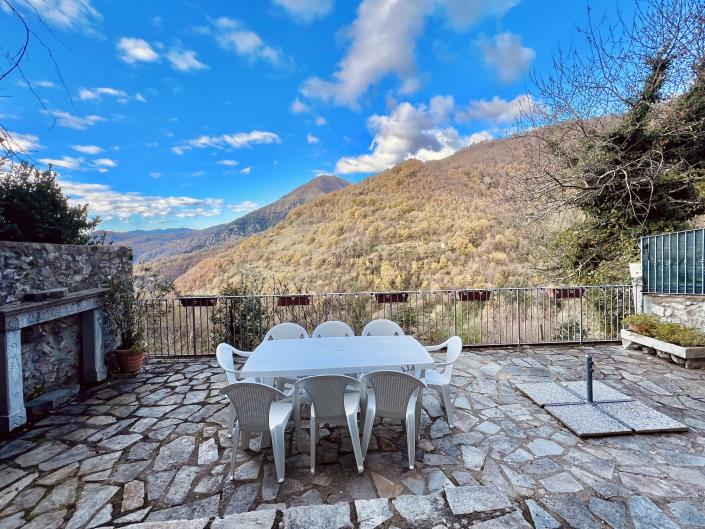 Step outside and follow the stone steps down to a paved garden terrace, where the view opens out across rolling hills, chestnut woods, and changing mountain light. It is an ideal spot for al fresco meals, morning coffee, or simply watching the sun dip behind the hills.