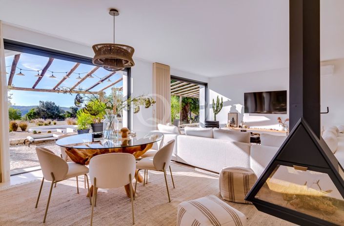 The main floor features a sun-filled open-plan living, dining, and kitchen area with premium Smeg appliances and a suspended fireplace, complemented by an office and a guest bathroom. Two bedrooms sharing a full bathroom complete this level. The private master suite occupies the entire upper floor, with floor-to-ceiling windows opening onto a balcony that frames breathtaking country views. Outside, a heated saltwater pool and a fire pit with seating create the perfect setting for relaxation and entertaining. Practical amenities include a three-car garage with a dedicated laundry space and a one-car carport. An independent guest house includes two bedrooms, an open-plan living area, a full bathroom, and a two-car carport. With its exceptional combination of space, privacy, and refined design, this villa embodies the ultimate countryside lifestyle near Loulé.