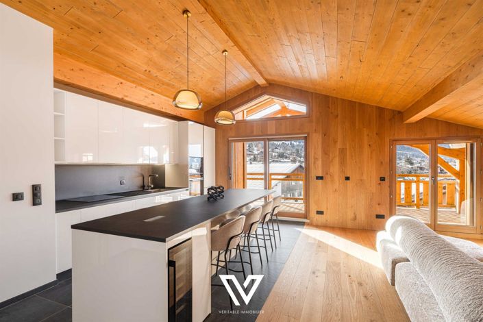 Just steps from the village centre and the ski slopes, this exceptional apartment occupies the entire top floor of a discreet chalet.