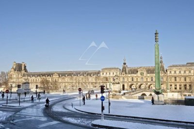 The property includes an entrance, a magnificent corner reception area with a west-facing exposure, enjoying a beautiful view of the Seine and the Louvre, a dining room, a fully equipped eat-in kitchen, two very large suites with bedroom, bathroom, dressing room, toilets, guest toilets, and plenty of storage.