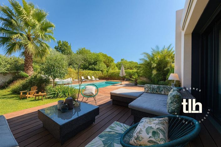 On the ground floor, you will find a large living room with open kitchen, a bedroom and a bathroom. Large bay windows open onto an elegant exotic wood terrace and a swimming pool without any vis-à-vis, ideal for taking full advantage of the sunny days.