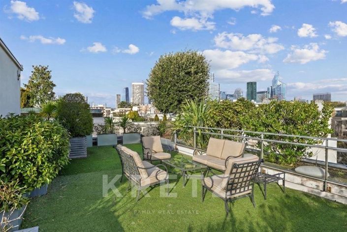 In a quiet, residential neighborhood, on the 3rd and top floor of a well-maintained building with an elevator, this 157 sq m (1,695 sq ft) duplex apartment offers 6 rooms, two balconies (12 sq m/129 sq ft) and a 175 sq m (1,884 sq ft) rooftop terrace. On the 3rd floor, a spacious entrance hall with storage leads to a bright, air-conditioned 80 sq m (861 sq ft) living area comprising an open-plan kitchen, dining room, and living room, all opening onto a balcony. The sleeping area includes a master suite with a dressing room, shower room, and office, as well as a children's bedroom and bathroom with a laundry area. On the 4th floor, a bedroom provides access to a landscaped rooftop terrace, offering magnificent 360-degree views of La Défense and various layout possibilities. Two cellars, a large garage, and a parking space complete this rare family property, conveniently located near all amenities and the Pont de Neuilly.