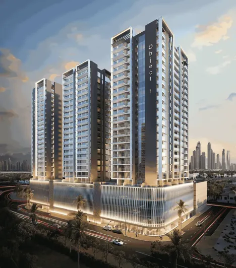 LUM1NAR Tower 2 is the second tower of a residential complex by Object One Real Estate Development, located in the Jumeirah Village Triangle area. The complex unites three towers that share a cohesive architectural style and modern design. The second tower consists of a ground floor, five podium levels, nineteen residential floors, and a roof.