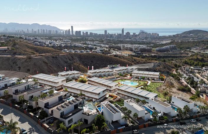 Perched above the Mediterranean coastline, these terraced villas in Balcón de Finestrat offer a contemporary take on hillside living, combining open views, everyday convenience and easy access to the coast. The setting enjoys a calm residential atmosphere with wide panoramas across the surrounding landscape, and all homes benefit from sea views extending towards Benidorm. Shops, restaurants, international schools and essential services are close at hand, while outdoor activities are woven naturally into daily life thanks to nearby walking routes, cycling paths, sports facilities and prestigious golf courses.The homes are available on 2 or 3 levels, all with 3 bedrooms and 2 bathrooms, arranged around a bright, open-plan living, dining and kitchen area. This main living space serves as the entrance level and also includes a guest toilet, designed to maximise natural light and create a fluid connection between indoors and outdoors. All 3 bedrooms are located on the first floor, including a master bedroom with en-suite bathroom, offering a practical and well-balanced layout for year-round living or extended stays.The living area, in the homes on 2 levels, opens directly onto a terrace and garden, ideal for relaxed outdoor dining and everyday enjoyment. While in the homes arranged over 3 levels, a versatile basement level opens onto its own terrace and an enclosed garden area with direct access to the community spaces, making it suitable as a leisure room, workspace or additional living area. Depending on the stage of construction, buyers can personalise the high-quality finishes by choosing from a selection of materials, and it is also possible to add an extra bathroom in the basement at additional cost.All homes include air conditioning, electric blinds in the living area and bedrooms, solar panels, and a parking space with pre-installation for an EV-charger, with some properties offering open-air parking depending on their position within the complex. The communal areas feature landscaped gardens with fully accessible pathways, a large pool for adults and a separate pool area for children.Nearby places of interest include Puig Campana Golf, reached in around 5 minutes by car and ideal for rounds of golf in a scenic mountain setting. The sandy beaches and vibrant promenade of Benidorm are approximately 10 minutes away, offering a wide choice of restaurants, cafés and seaside activities, while the marina of Villajoyosa, with its colourful harbour and relaxed waterfront dining, is about 15 minutes by car. Alicante airport is reached in around 35 minutes, making travel straightforward and convenient. Together, these nearby highlights create an appealing balance of sea views, leisure options and everyday connectivity for enjoying the Costa Blanca lifestyle throughout the year.