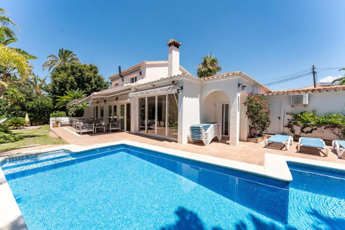 Beachside villa in Marbella. This 2-storey property consists of a living room, a well-equipped kitchen with dishwasher, 5 bedrooms and 3 bathrooms and can therefore accommodate 10 people. Additional amenities include high-speed Wi-Fi, air conditioning, a washing machine as well a satellite TV and a DVD player. Private outdoor area includes a pool, a garden, garden furniture, an open terrace, a balcony and a barbecue. Parking is available on the property.