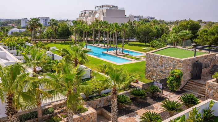 Residents benefit from immaculate communal areas, including a 40 m² swimming pool and lush Mediterranean gardens complete with sunbeds, an idyllic setting to unwind and embrace the resort lifestyle.