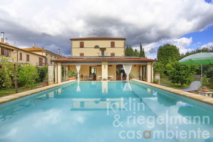 The property is rounded off by a separate building of approx. 80 m², currently used as a gym, with a bathroom and traditional Tuscan wooden beam ceiling with terracotta tiles, as well as an 8 x 5 m swimming pool with a spacious outdoor area.