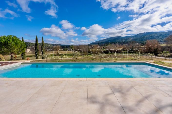 The house sits on nearly two acres of land. It is surrounded on two sides by a shaded tiled terrace, perfect for outdoor entertaining. Adjacent, facing the mountains, with a newly planted olive grove before it, lies the inviting 12m x 4m saltwater swimming pool with a lovely stone surround, providing plenty of space for relaxing poolside. Overlooking the swimming pool is a shaded sitting area. A 70-year-old cedar tree towers majestically over the lower part of the grounds, which then extend upwards behind the property. This typically Provençal terraced land is densely populated with mature native species such as truffle oaks.